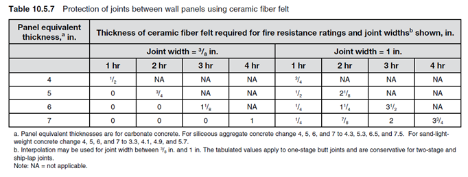 Fire resistance required for the wall shall be provided at the joints when no openings are permitted. PCI Table 10.5.7 shown below is based on the results of fire tests of panels with butt joints. The tabulated values apply to one-stage butt joints and are conservative for two-stage and ship-lap joints.