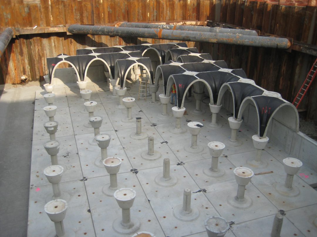 Delta Precast was contracted by Rotondo Environmental Solutions to design a 50,000 gallon underground cistern which will collect and reuse rainwater to irrigate the park’s lawn and plants. Two cistern (stormPod) systems were designed for the project. The two systems have interior height of 10ft and 8ft respectively, both systems consist of 360 degree, 180 degree modules, pedestal supports on precast floor and parameter soil retaining units. Structural design of the two systems were based on an equivalent fluid pressure of 60 pcf, fill height of 1ft -18ft, HS-20 live load, ACI 318 and ACI 350. 3.0 lb/cyd of Turf-Stand fibers were used in combination of conventional ASTM A615 grade 60 reinforcing to minimize temperature and shrinkage cracks.